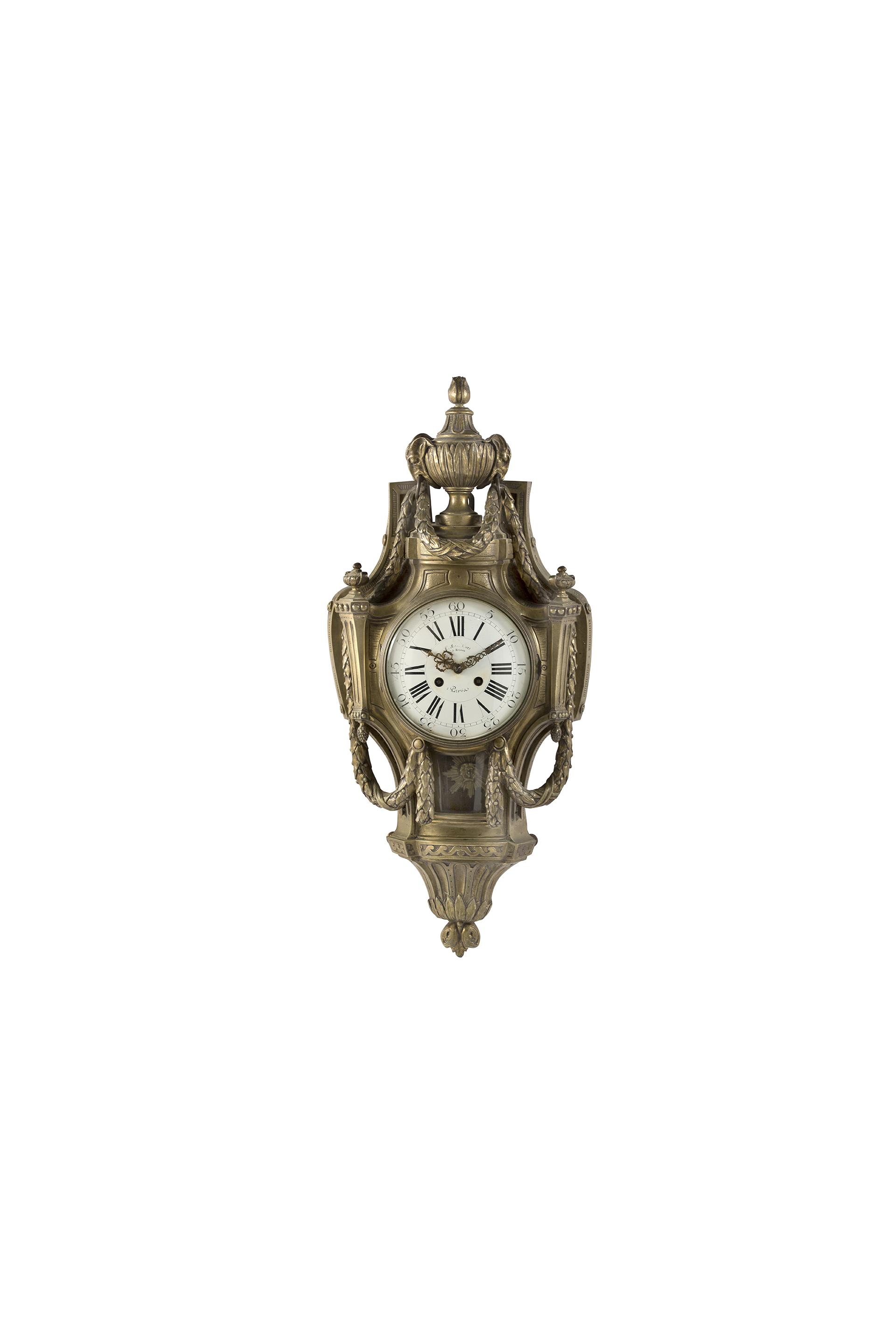 CARTEL D'APPLIQUE en bronze doré, ornementation de guirlandes de lauriers, cassolette et cul de lampe. Cadran émaillé blanc.