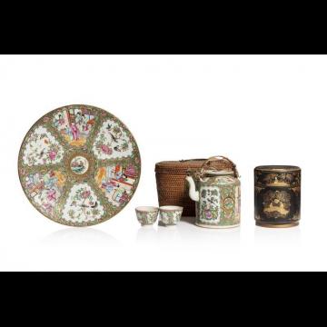 Lot comprenant une théière avec deux petites coupes, en porcelaine et émaux de la famille rose, à décor de scènes animées de personnages, oiseaux et fleurs, papillons, dans son coffret en vannerie ; une boîte cylindrique en bois laqué noir et or, ornée de personnages et fleurs.