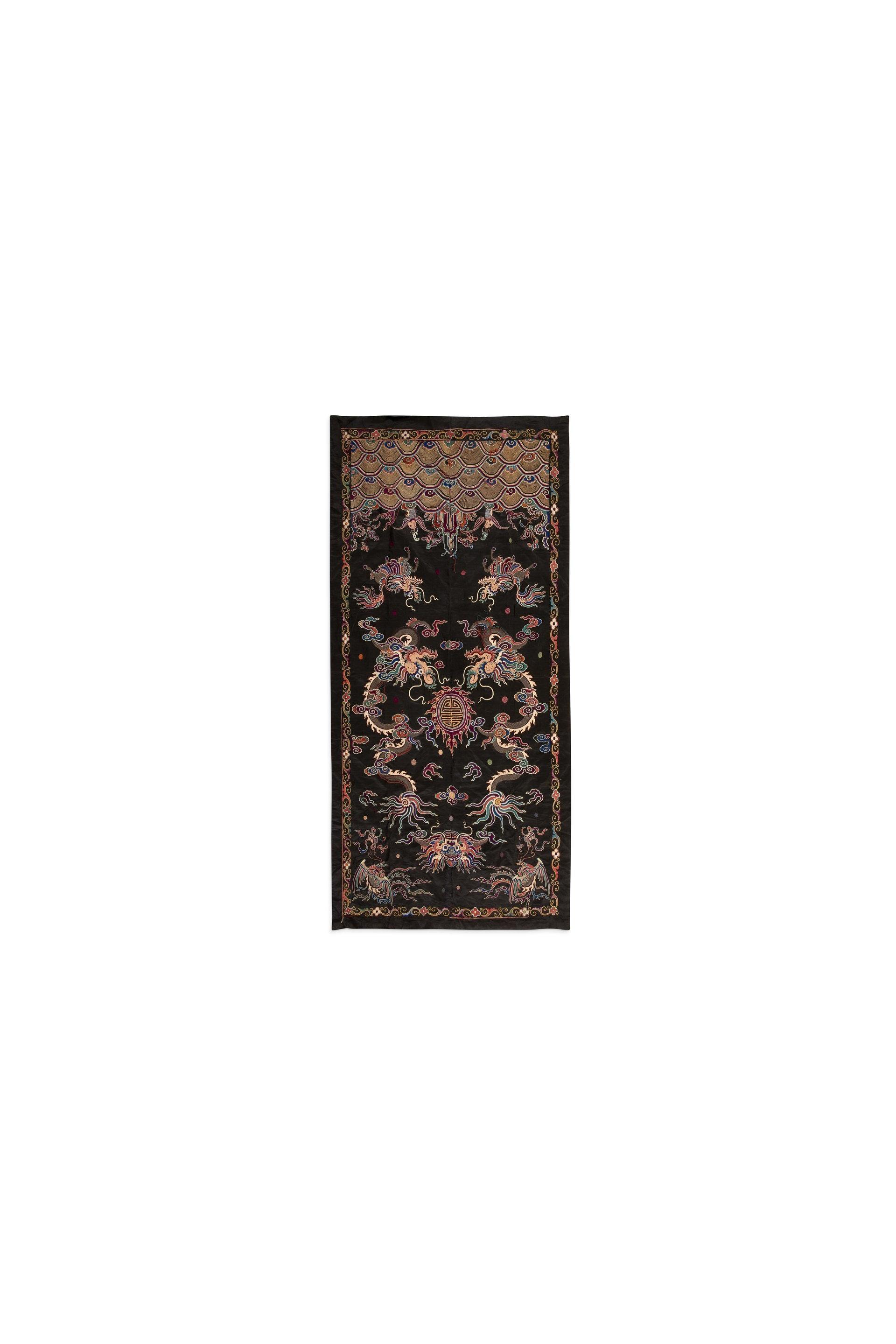 Grande tenture en soie noire brodée aux fils polychromes, ornée de deux grands dragons de profil, tête en bas, de part et d'autre du joyau sacré flammé, portant le caractère shou, longévité ; en partie haute, évoluent deux phénix et un masque de dragon ; la partie basse présentant deux qilin au-dessus des flots d'où émergent les pics sacrés et des poissons dragons.