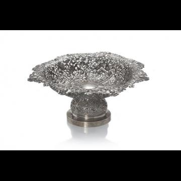 Coupe en argent sur piédouche, entièrement ajourée, à décor de fleurs, fruits, dragon et oiseaux, inscrits dans des pétales rayonnant autour d'un centre floriforme, le pourtour mouvementé, le pied galbé divisé en panneaux de motifs floraux. Avec poinçons Houxiang et SF sur le pied.