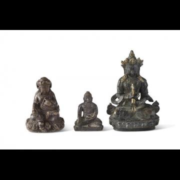 Trois petits sujets dont deux en bronze, représentant Vajrasattva, et le Bouddha Sakyamuni, et un en pierre figurant Jambhala.