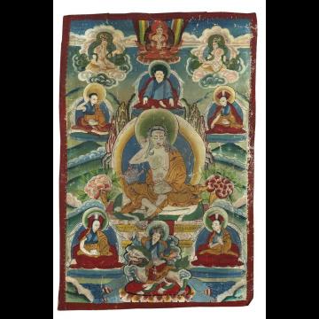 On y joint un thangka (Tibet, fin XIXe siècle) en polychromie sur textile représentant Milarepa assis à l'écoute entouré de divinités tutélaires et différents lamas dans un paysage de montagne.