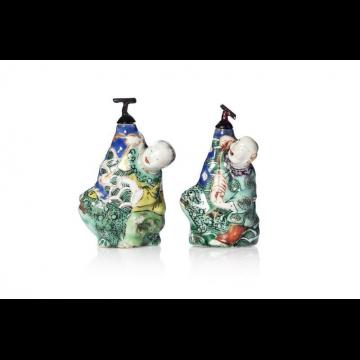 Lot de deux flacons tabatières en porcelaine et émaux de la famille rose, représentant Liu Hai accompagné du crapaud à trois pattes et tenant des sapèques.