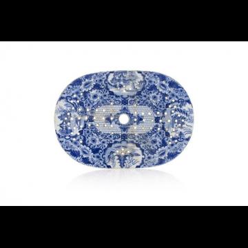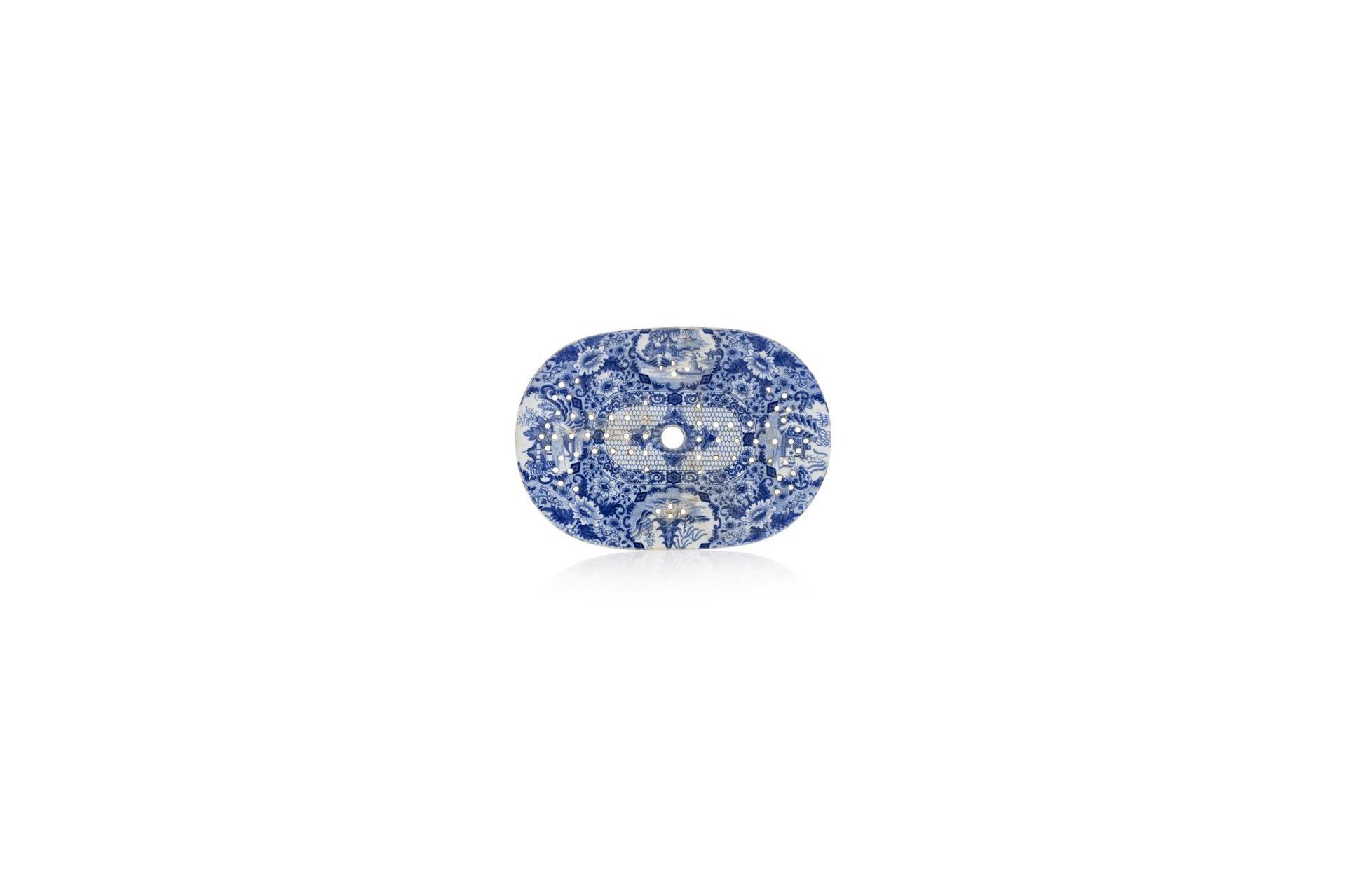 Chauffe-plat ovale en porcelaine, à décor émaillé en bleu sous couverte de pagode, temple et pavillons, parmi des lotus et rinceaux feuillagés, une frise fleurie souligne la partie centrale à motifs d'alvéoles et composition florale.