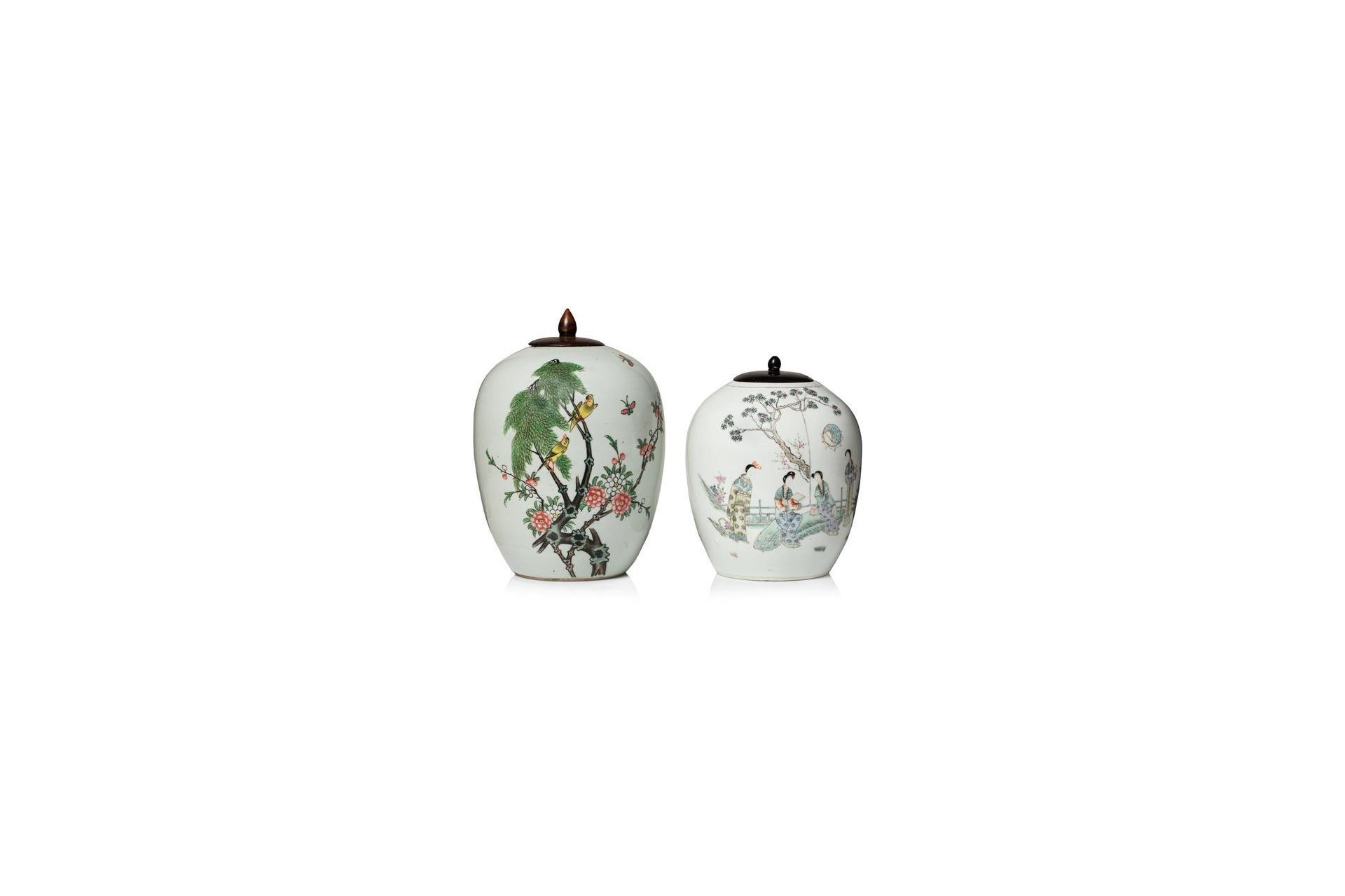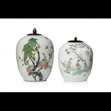 Deux pots-à-gingembre en porcelaine et émaux de la famille rose représentant un couple de pies sur de jeunes arbustes en fleurs et quatre jeunes femmes s'adonnant à la lecture sur une terrasse.