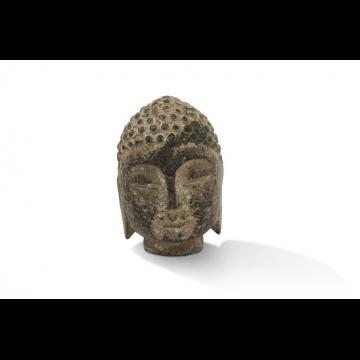 Petite tête de Bouddha en pierre, les yeux mi-clos et esquissant un léger sourire.