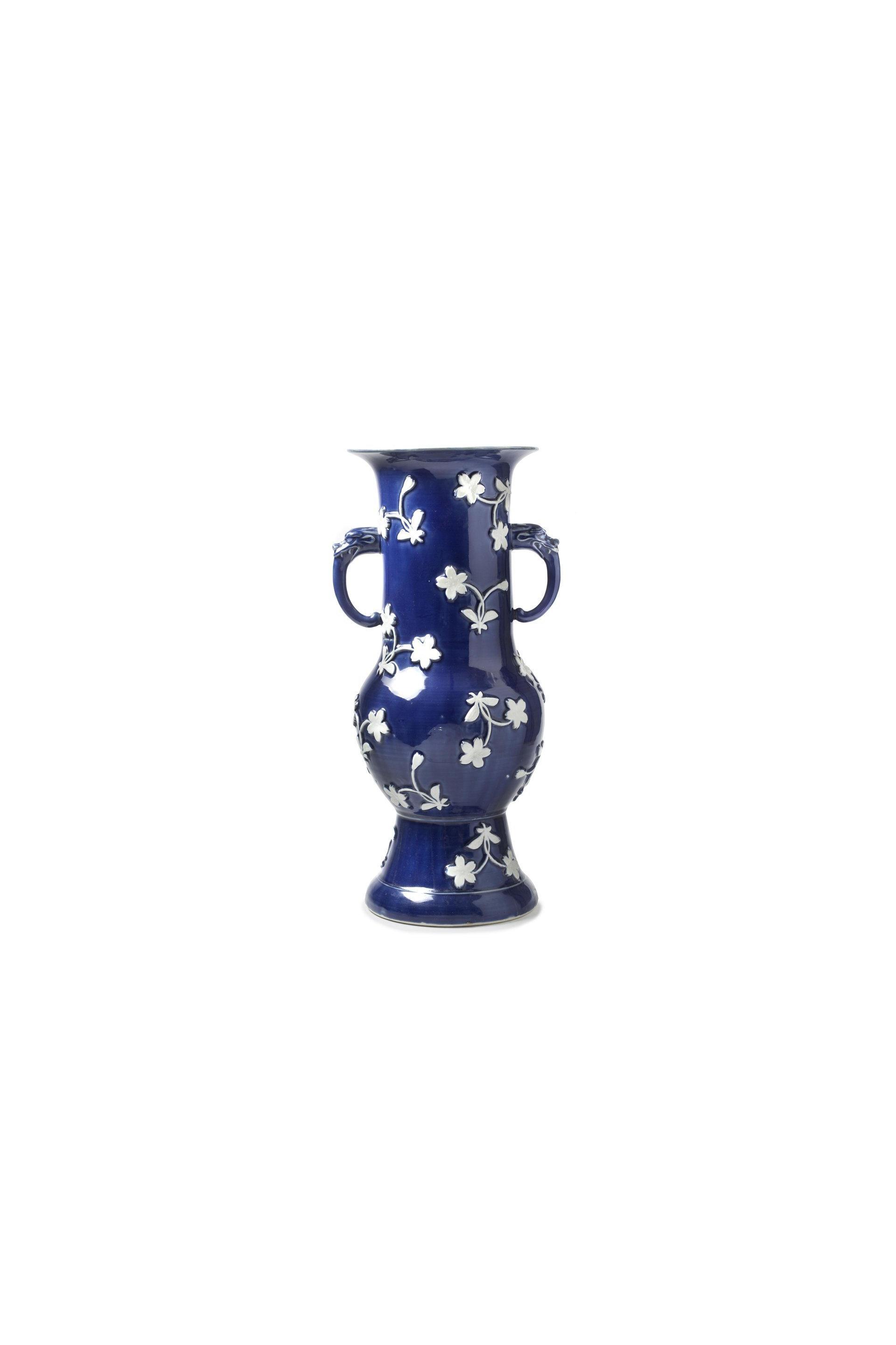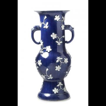 Grand vase en porcelaine à décor floral blanc sur fond bleu, aux anses crachées par des dragons.