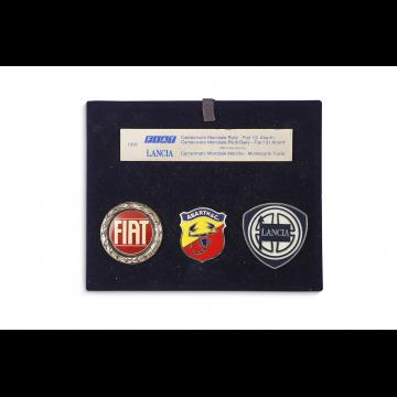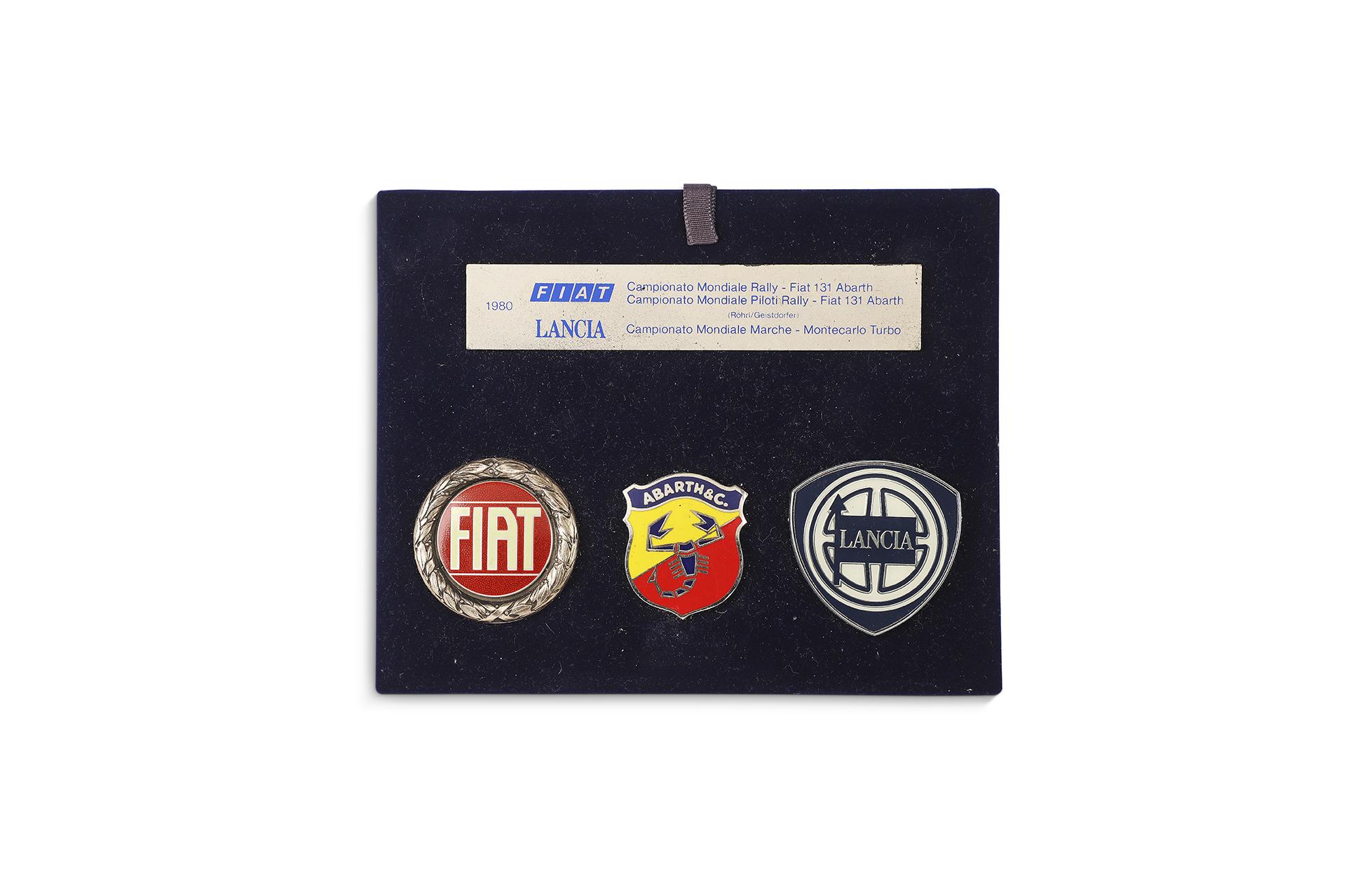 3 badges émaillés fixés sur socle commemorant les victoires de la Fiat 131 Abart pilotée par Walter Röhrl et du Team usine lors du Championnat du Monde des Rallyes 1980, ainsi que la victoire de la Lancia Montecarlo Turbo lors du Championnat des Marques 1980