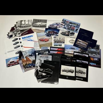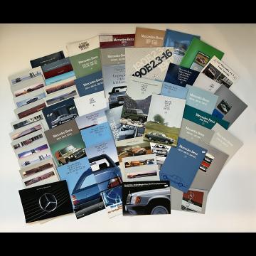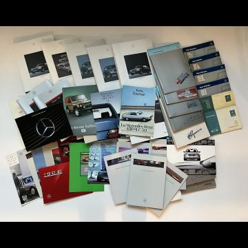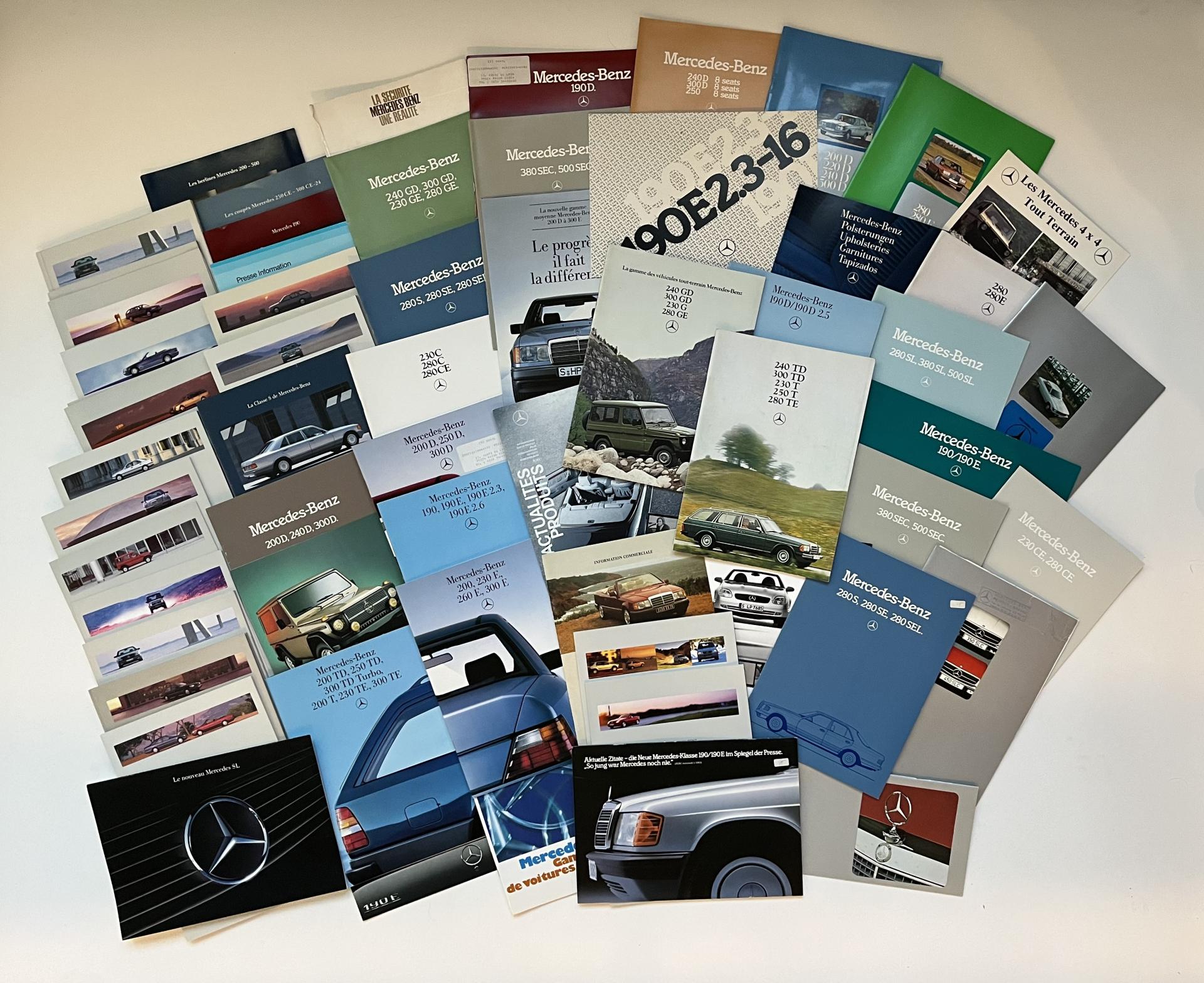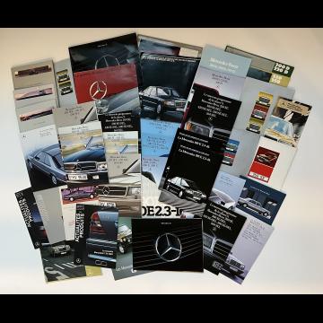 Important lot de catalogues et divers documents présentant les modèles suivants classe C, E, G, SL, S, SE, SEL, SEC, SLK, TD, T, TE, W124, R124, S124, 190E, 200, 240, 300, 28, 500...