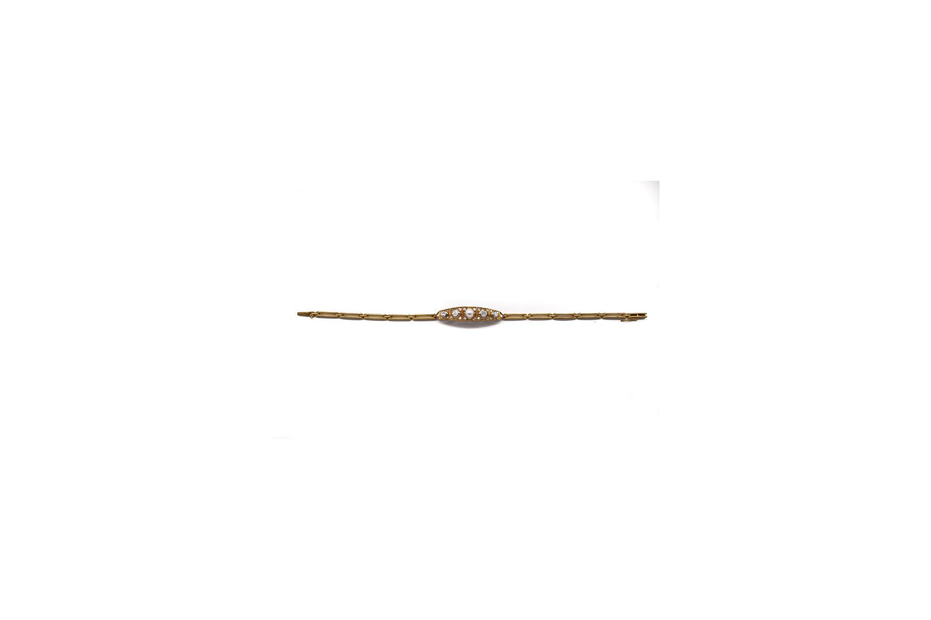 Bracelet en or jaune 18K (750) sertie d'une perle de culture épaulée de diamants de taille ancienne.