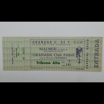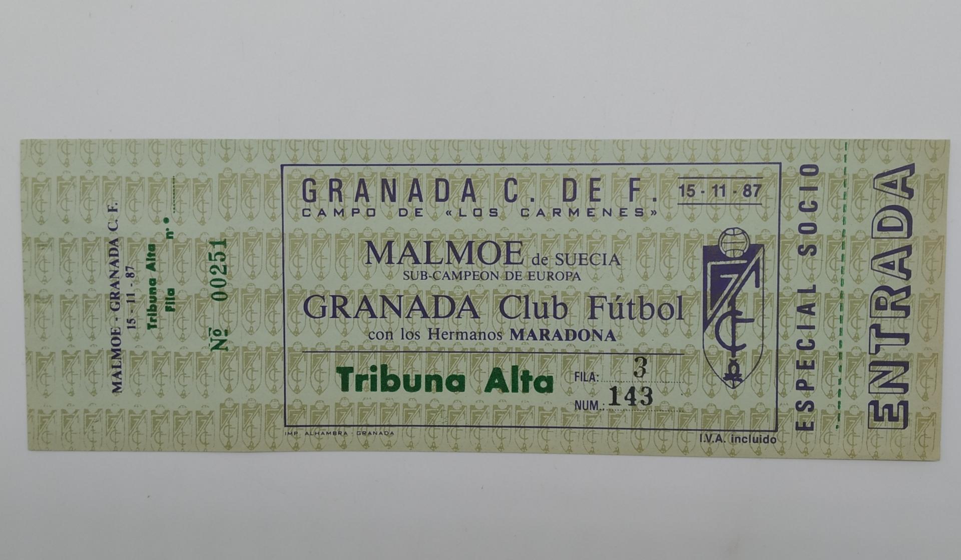 Billet de match Granada vs Malmo avec la présence des frères Maradona. Il s'agit du match où Diego Maradona a participé pour offrir la possibilité au club de Granada de faire signer son frère.