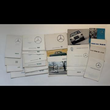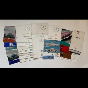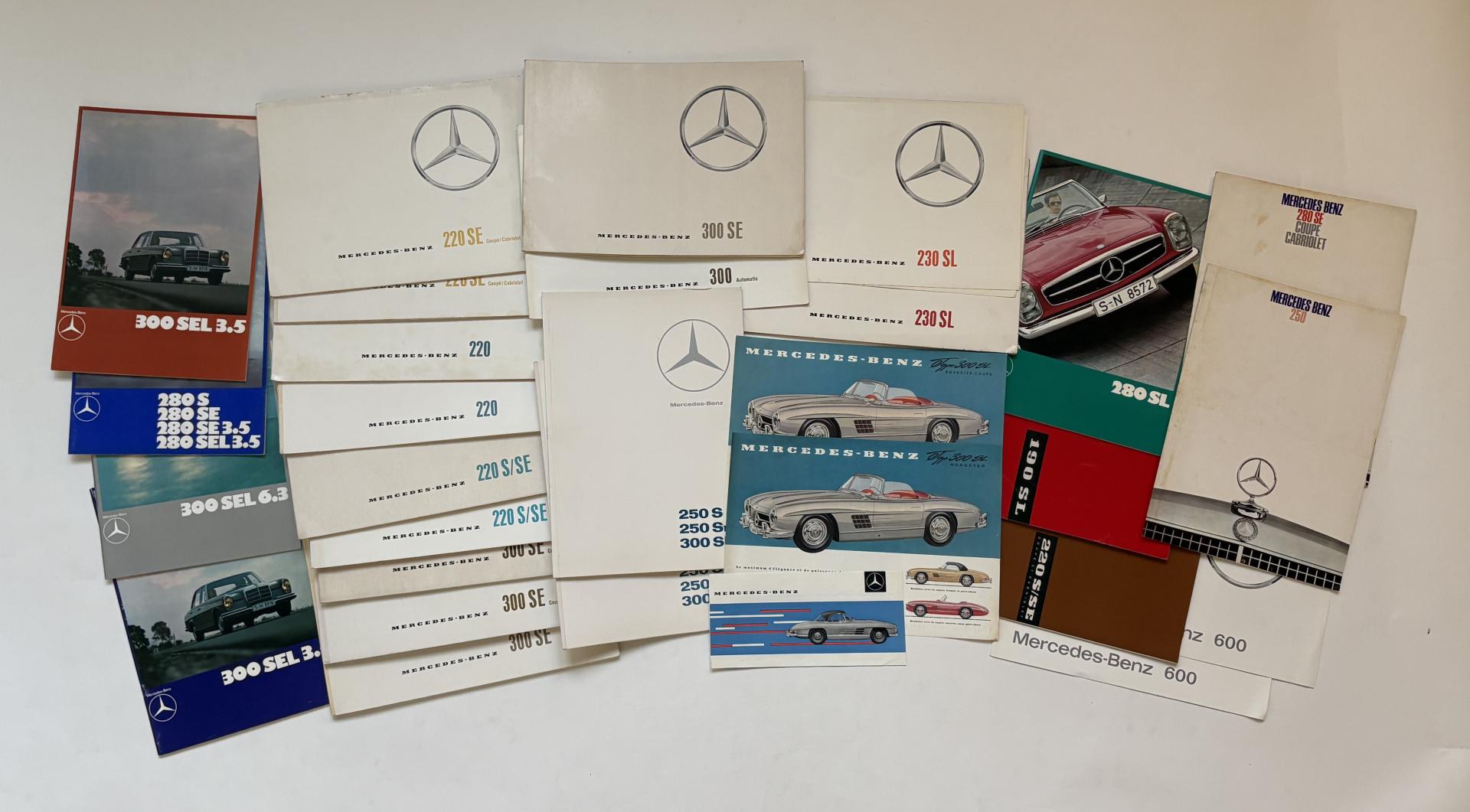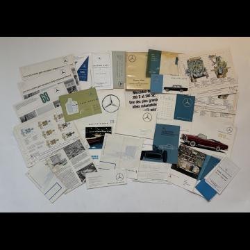 Important lot de catalogues et divers documents présentant les modèles suivants : 190 SL, 300 SL, 180, 190, 200, 220 S SE, 230, 250, 280 S SE, SE 3,5l, 280 SL, Pagode, 300 S, 300 SE, SEL 3,5 , SEL 6,3, 600…