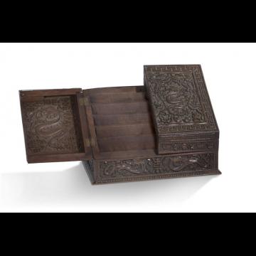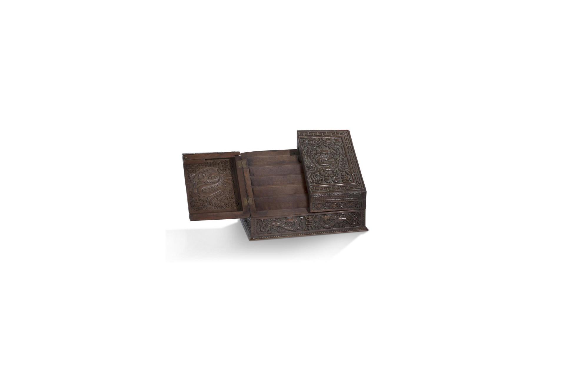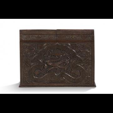 Porte-documents ouvrant à deux portes sur quatre rangées, en bois, à décor sculpté de dragons et chauves-souris stylisés parmi des fleurs.