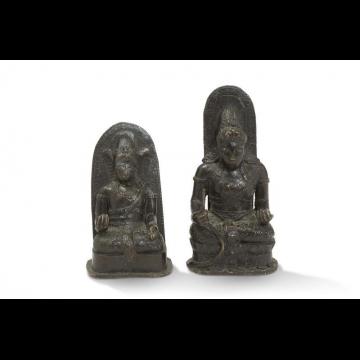 Deux sujets bouddhiques en bronze représentant des bodhisattva assis en méditation adossés à des mandorles.