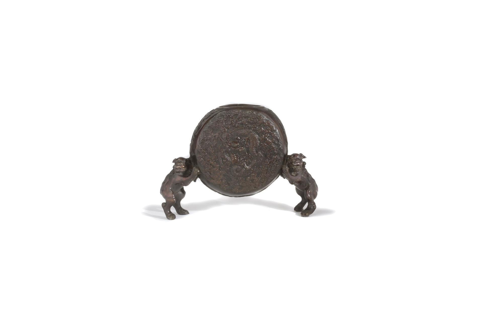 Brûle-parfum ou vase de forme circulaire en bronze de patine brun-rouge, orné de deux médaillons ciselés représentant un dragon et une tortue minogame évoluant parmi des nuages. Deux shishi dressés forment la base.