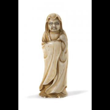 Okimono en ivoire figurant Daruma tenant son chasse-mouches.