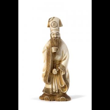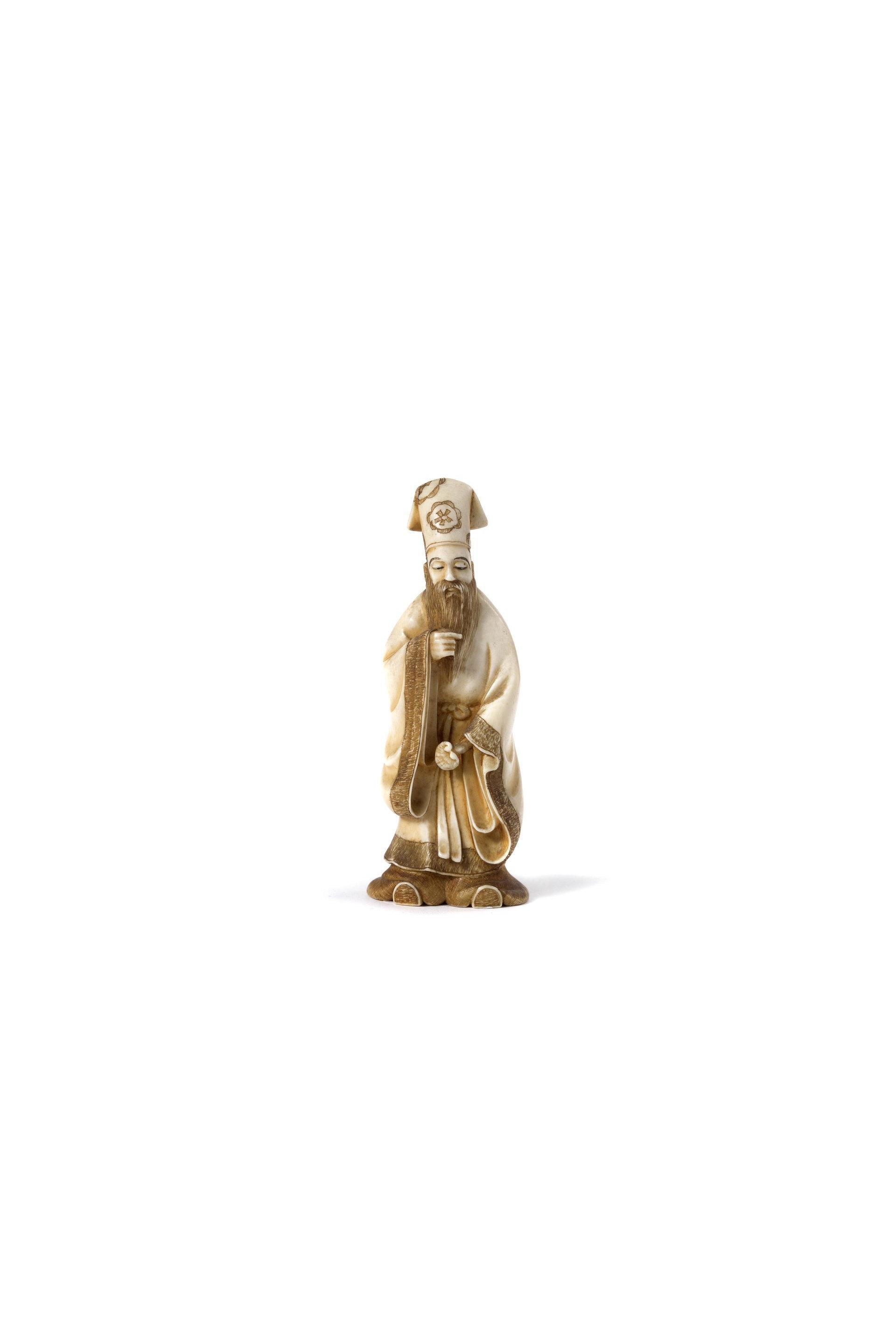 Okimono en ivoire figurant un dignitaire chinois tenant un ruyi.