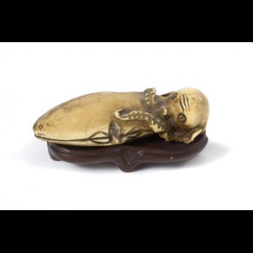 Netsuke en ivoire représentant un poulpe sur un coquillage.