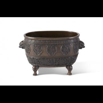 Brûle-parfum en bronze de patine brune, de forme ovale sur quatre pieds, la paroi à décor archaïsant organisé en trois registres : de médaillons de fleurs de lotus, réserves ornées de tortues minogames et frises de pétales de lotus stylisés ; de deux têtes de félins formant anses complétant le décor.