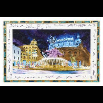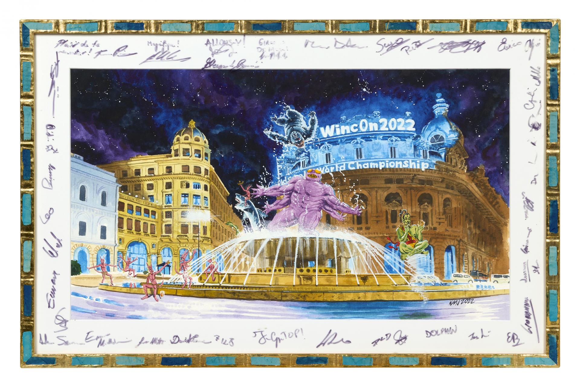 KEN MEYER Jr, Tableau des Championnats du Monde Old Scool de 2022, acrylique avec dédicace dont des 20 meilleurs joueurs du monde sur la vitre, signée en bas à droite et datée 2022, 45x69 cm