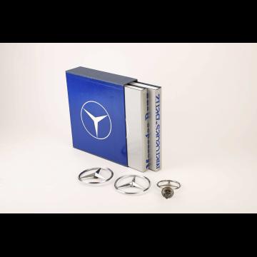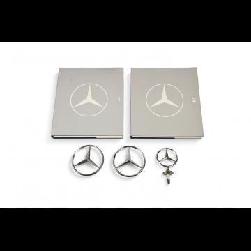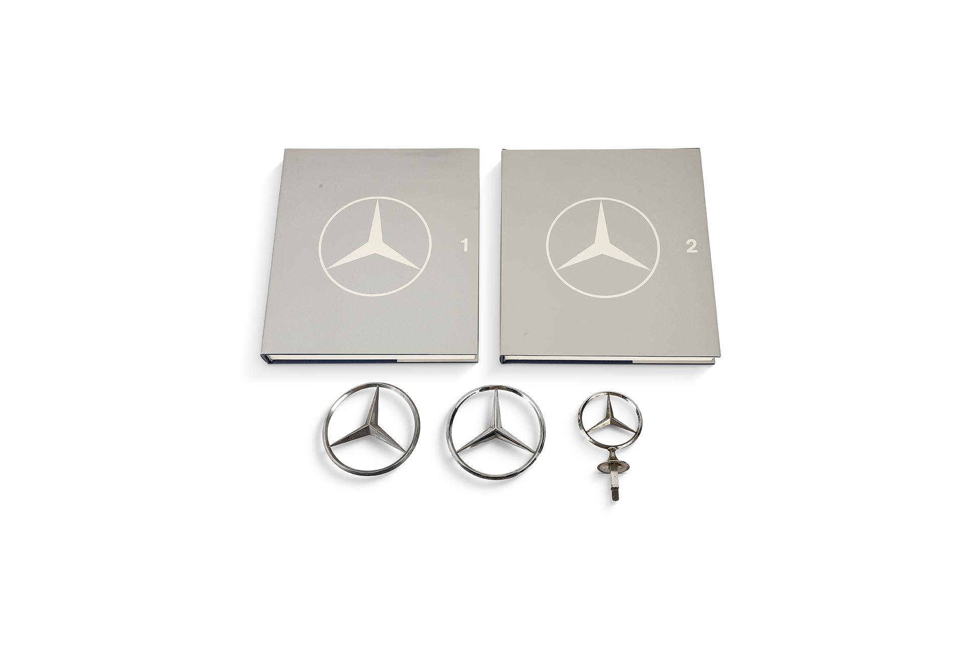 Lot comprenant un coffret doté de 2 livres sur la marque edition Automobilia, de 3 insignes de capot et de 2 épinglettes (500 000 et 1 000 000 km)