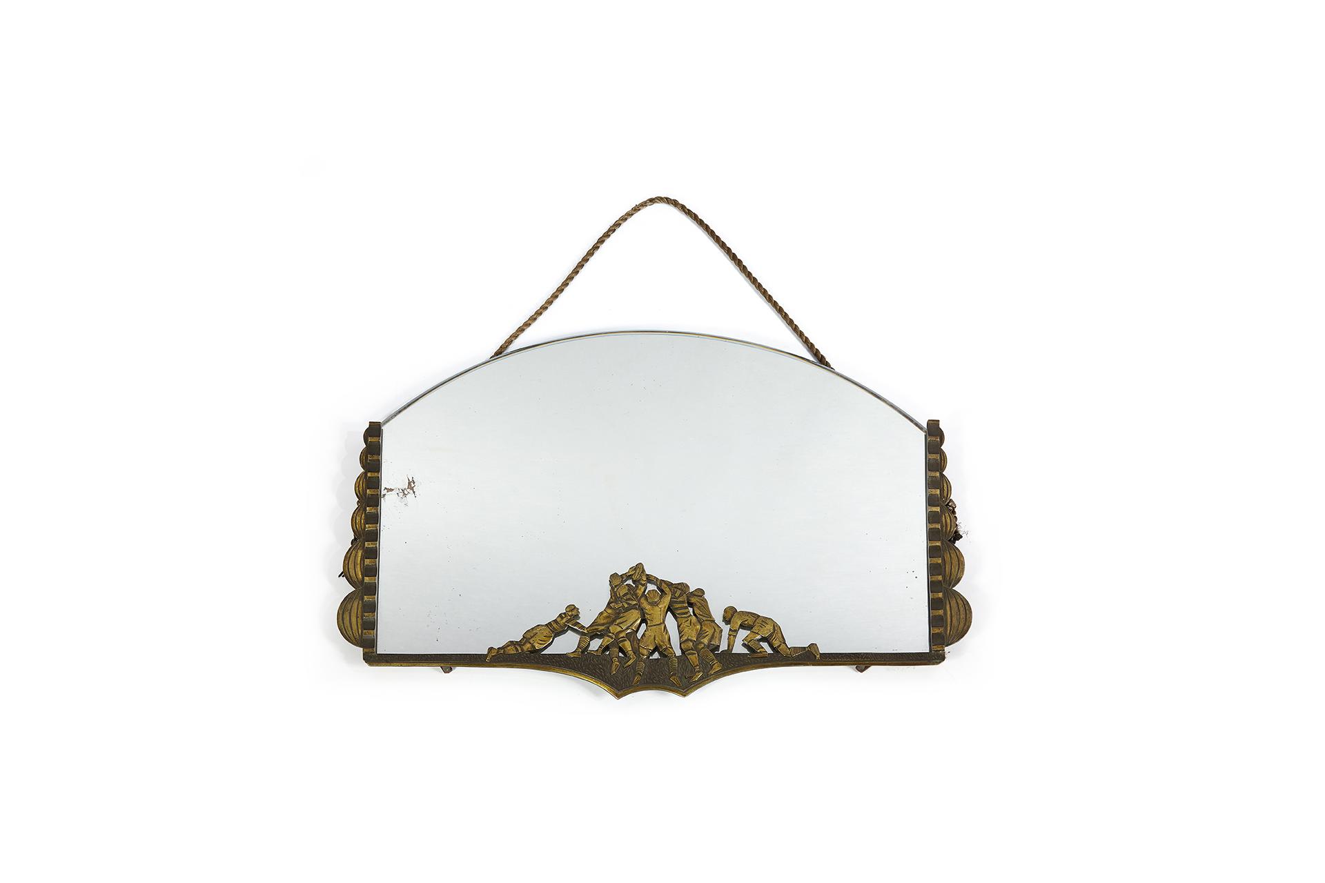 MIROIR à encadrement en bronze, patine argentée figurant des joueurs de rugby, ensserrant une glace rectangulaire cintrée.