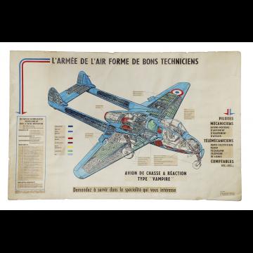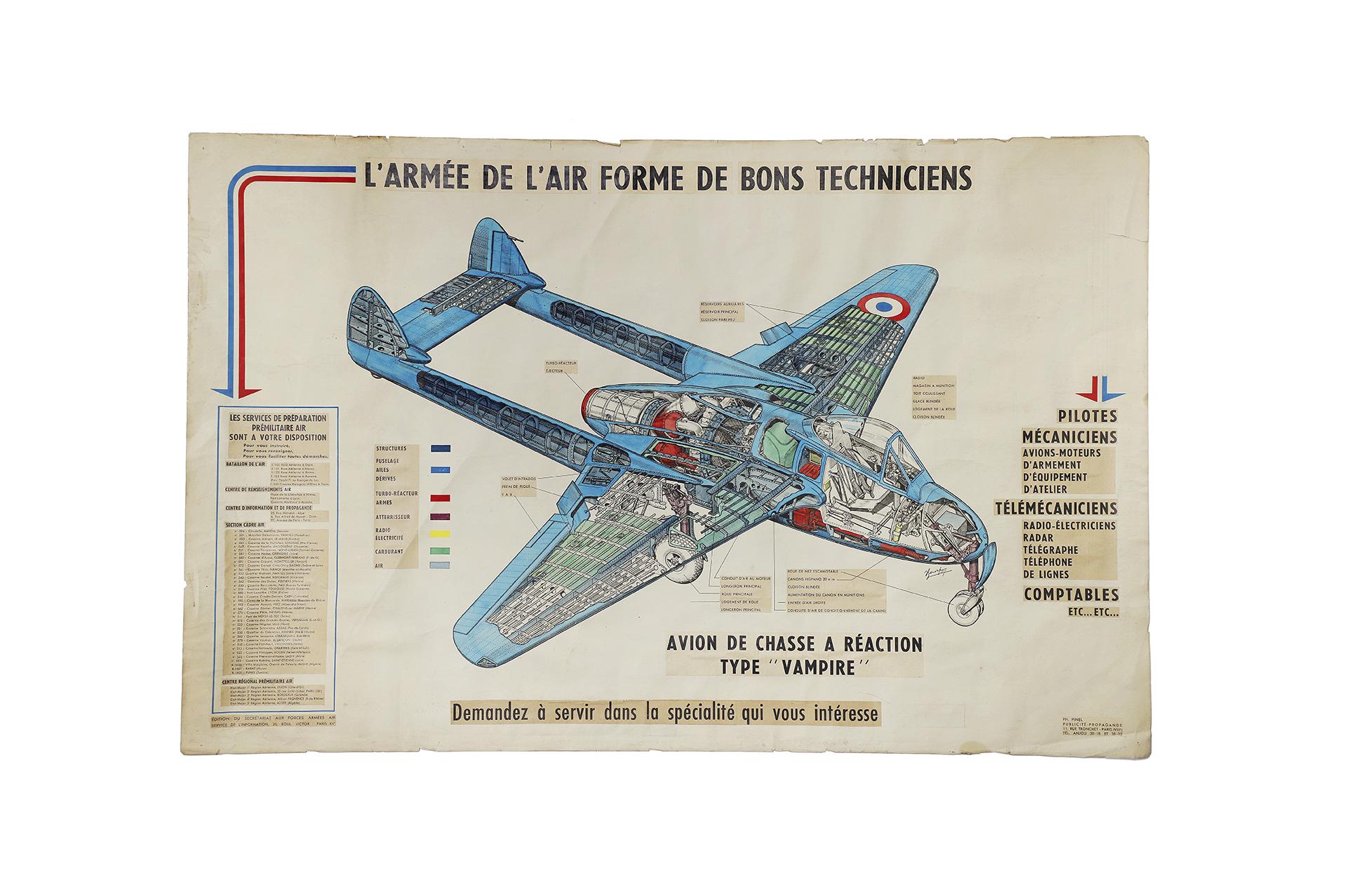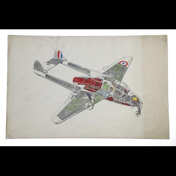 Dessin à l'encre de chine noire et couleurs, écorché de l’avion de chasse à réaction, type Vampire. Signature illisible sous le nez de l’appareil. Légendée au crayon. Déchirure sans manque dans le haut. On joint le projet d’affiche qui en a été tiré, destiné à une propagande pour l’Armée de l’Air.