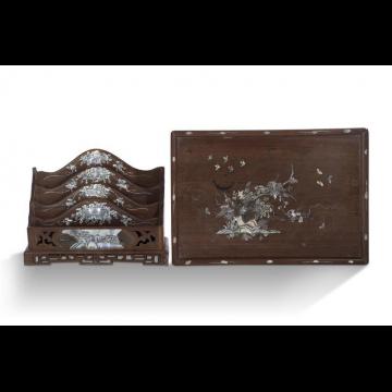 Lot de deux objets en bois de rose incrusté de nacre comprenant un plateau à décor d'oiseaux, papillons et arbustes ; et un trieur à quatre compartiments orné de rinceaux et pavillons.